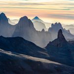 Vor uns steht die markante Gruppe der Basaltfüllungen dreier Vulkane – die zwei links mit dem gleichen Namen, Tezhouai, der rechts: Trichet. Nun gehen wir in die andere Richtung zum Sonnenuntergang, bei der Mess-Station, und sehen die Sonne beim Tahat, 3008 m, untergehen, dem höchsten Berg des Hoggar.