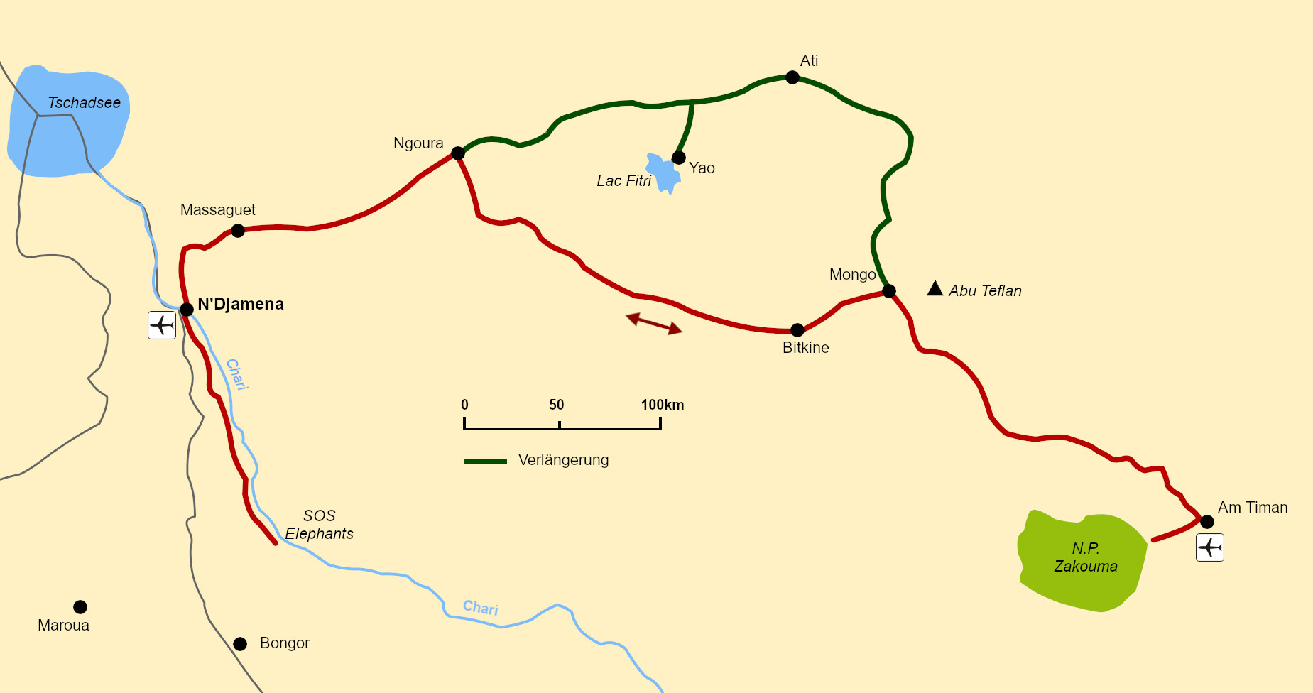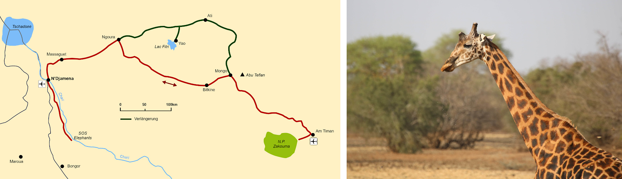 Alternativ – wenn es wieder Flüge nach/bis zum Ort Am Timan gibt (ca. 70 km östlich): weiterer Tag im Nationalpark, Flug nach Ndjamena am 8. Tag (dadurch können sich geringfügig die Reisedaten ändern).