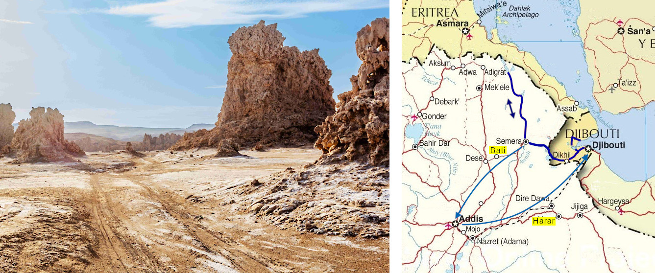 Eine Kurzreise mit spektakulären Landschaften entlang des ostafrikanischen Grabenbruchs und dazu noch günstig – das ist möglich geworden durch eine neue Straße durch die Danakil-Depression (bis zu 150 Meter unter dem Meeresspiegel). Und natürlich wurde sie von Chinesen gebaut, die in Äthiopien stark engagiert sind – sie bauten auch die alte koloniale Bahnverbindung nach Djibouti bis 2017 neu.